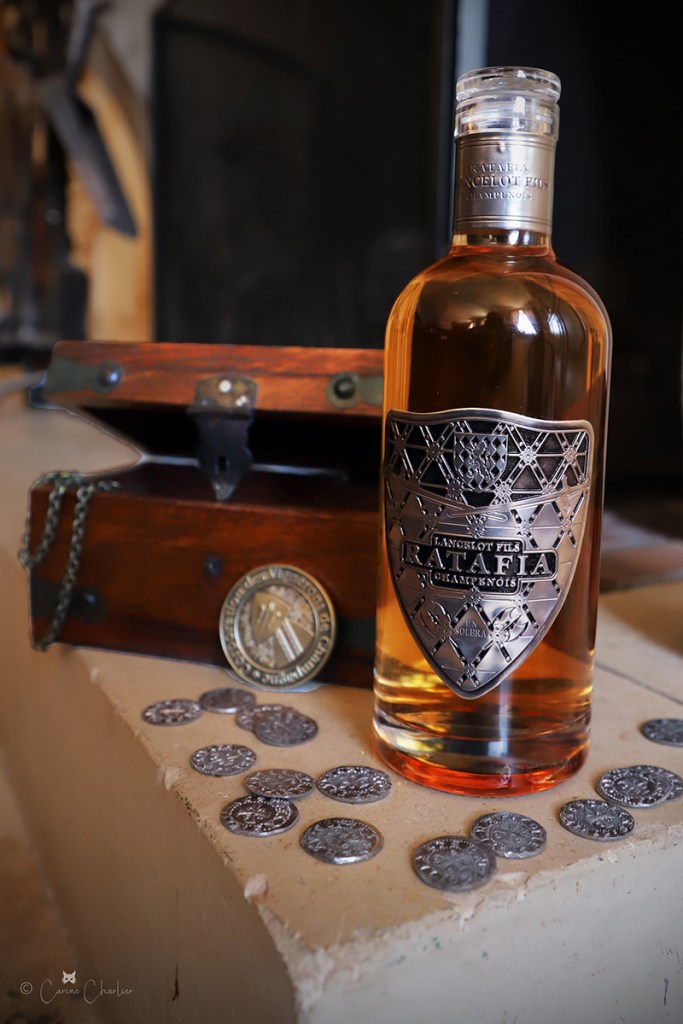 - son emballage soigné au style médiéval avec étiquette en étain. Pour la réaliser, nous avons repris le blason en conservant en fond la charte graphique de l’étiquette champagne et en faisant apparaître des armoiries.