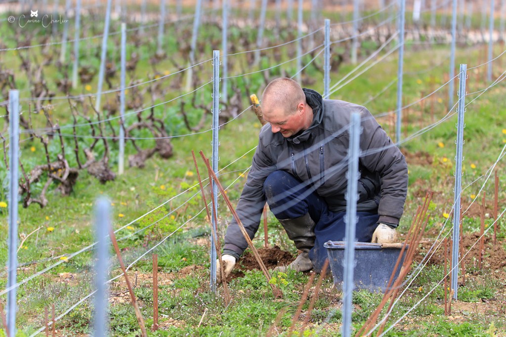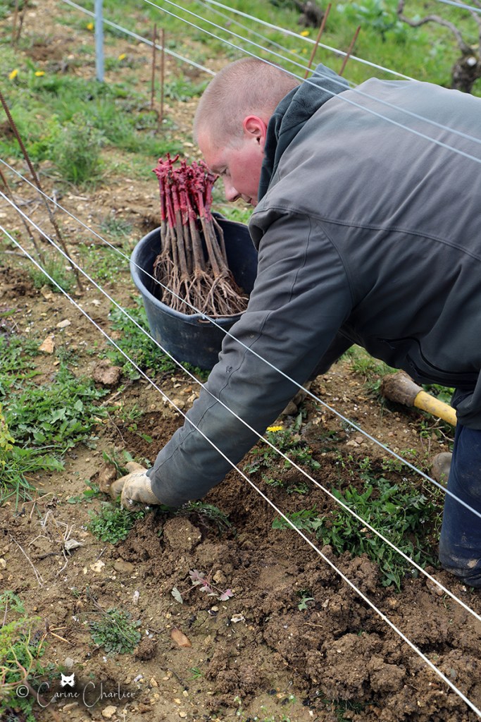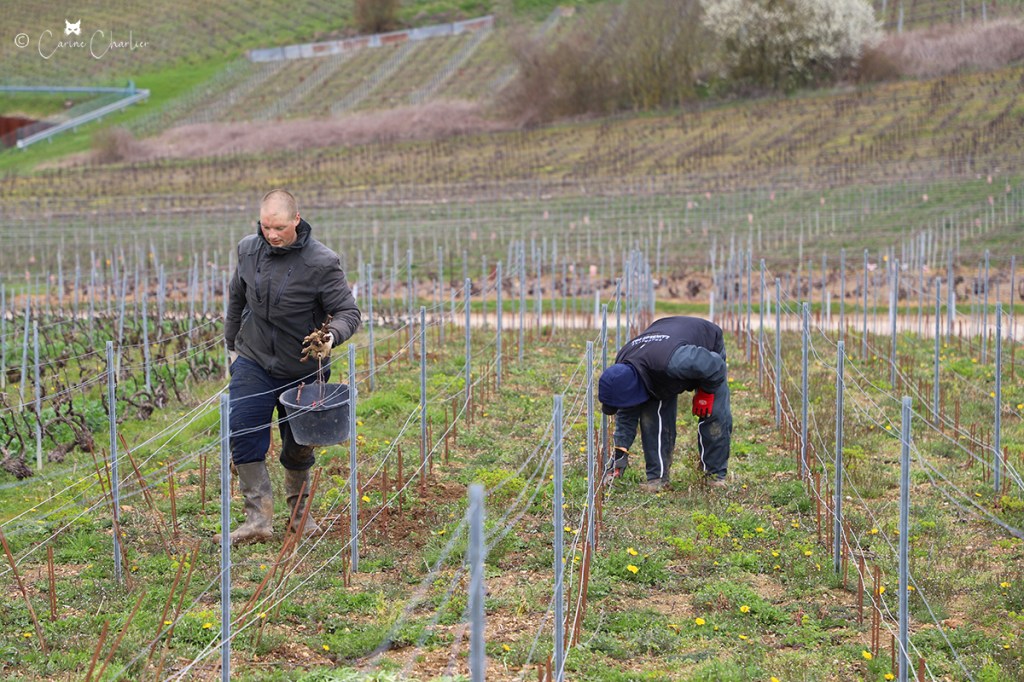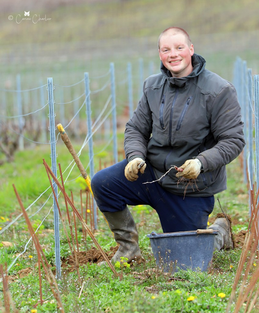 Le printemps, la saison pour l’entreplantation de la vigne ! Celle-ci consiste à remplacer les pieds de vigne qui sont morts (1 à 2%) à cause de la maladie (notamment l’Esca, maladie du bois) ou d’un heurt avec le chenillard. On entreplante à l’automne ou au printemps. Cette année, nous le faisons à la fin de la saison de taille. Sur les clichés ci-dessous, Jordan entreplante, pendant qu’Hubert taille de jeunes plants.