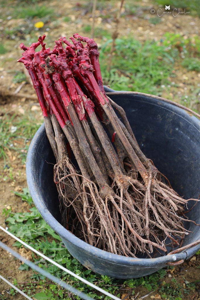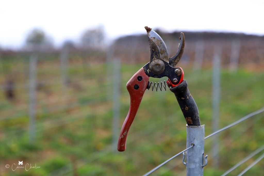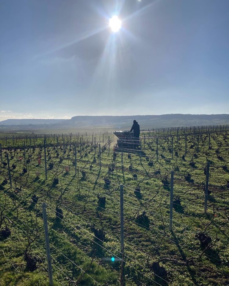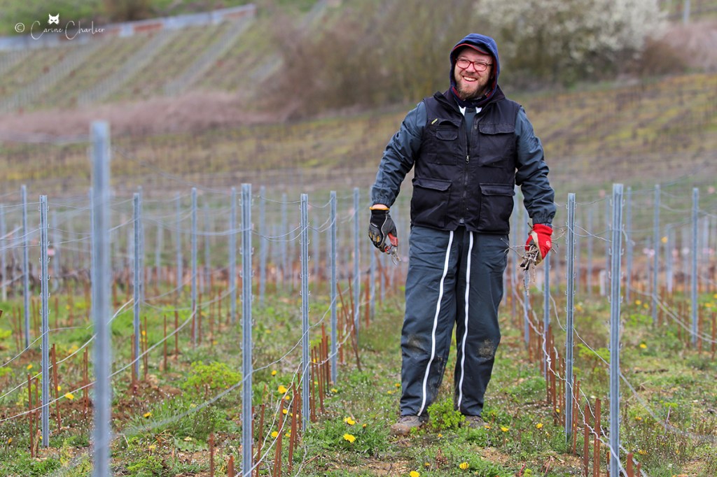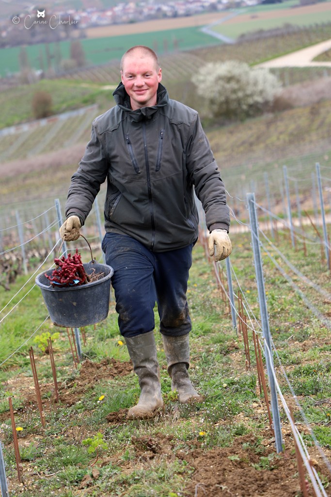 Le printemps, la saison pour l’entreplantation de la vigne ! Celle-ci consiste à remplacer les pieds de vigne qui sont morts (1 à 2%) à cause de la maladie (notamment l’Esca, maladie du bois) ou d’un heurt avec le chenillard. On entreplante à l’automne ou au printemps. Cette année, nous le faisons à la fin de la saison de taille. Sur les clichés ci-dessous, Jordan entreplante, pendant qu’Hubert taille de jeunes plants.